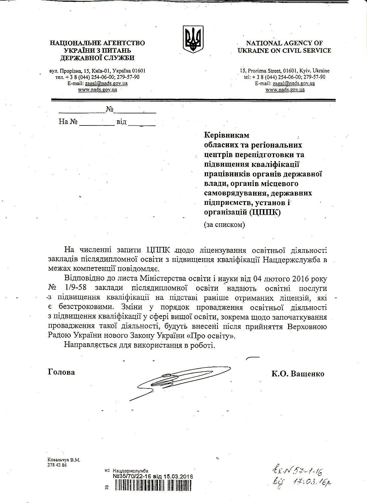 05 грудня 2002 р. Центр отримує ліцензію Міністерства освіти і науки України (серія АВ № 159823) на впровадження освітньої діяльності з підвищення кваліфікації державних службовців, працівників державних підприємств, установ і організацій за напрямом 1501 „Державне управління”. |